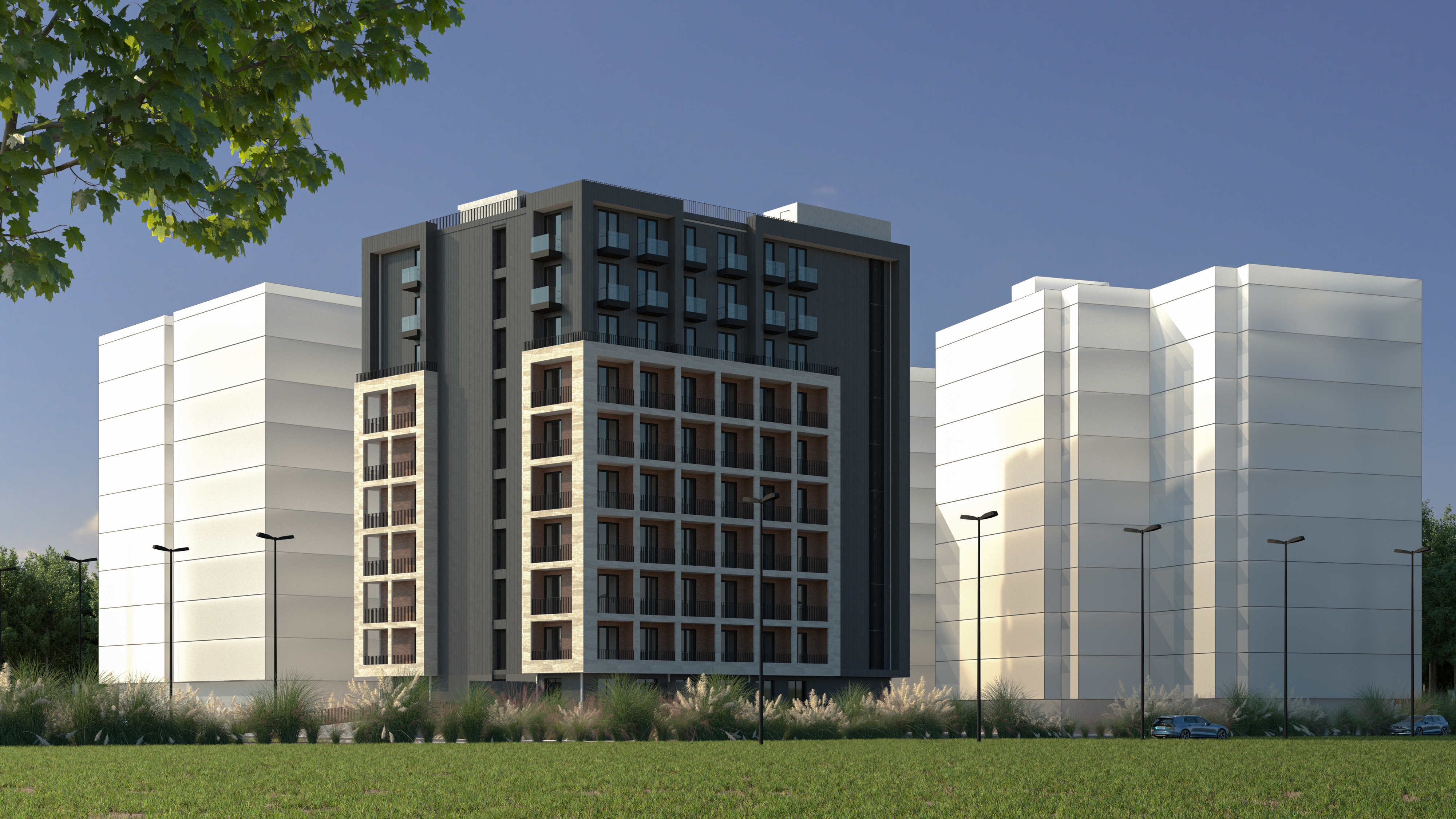 Block B - An 11-story above-ground and two-story underground residential building, This block consists of 60 apartment units and 26 parking spaces, with the first floor housing a kindergarten for Geo Sky School.